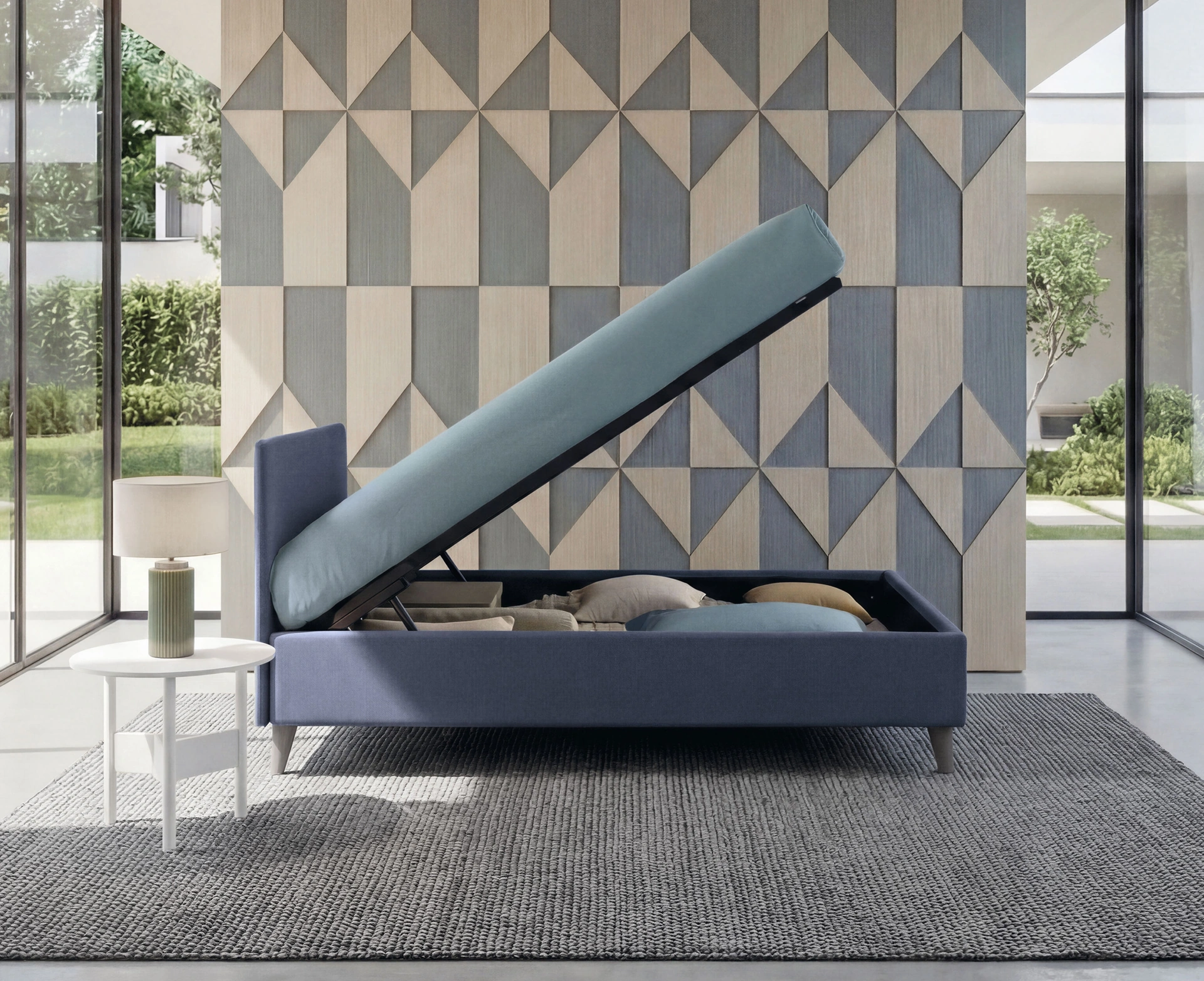 Il letto singolo Golf 203 in tessuto in foto, tra i modelli con contenitore moderni di Oggioni, è ideale per garantire il sonno più profondo.